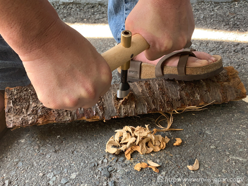 専用ハンドルにお好みサイズの木工ドリルが取付できる。ブッシュクラフトの幅が広がるアイテムです。