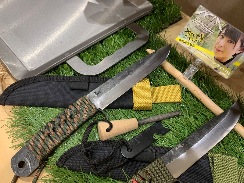 本気で無人島生活を目指し様々なサバイバル体験をこなすユーチューバーとして活躍中の かほなん! その活動の中培った経験を基に『薪割りから料理まで、1本のナイフできっちりこなしたい』との思いから今回のナイフに辿り着きました。鍛治屋 池内刃物が作る従来のバトニングナイフ150にかほなんの思いを込めた『さばいどる仕様』に変更しております。より先端を使い易く、刃先の背側を鋭角に削りました。鋭利な刃先は食材もストレス無くスッと切れ、薪割り・フェザースティックも楽々こなします。刃と柄が一体型(フルタング)で非常に丈夫、壊れません。ケースにファイアースターター(別売)などを取付けできるゴム付ですので焚き付け用携帯に便利です。