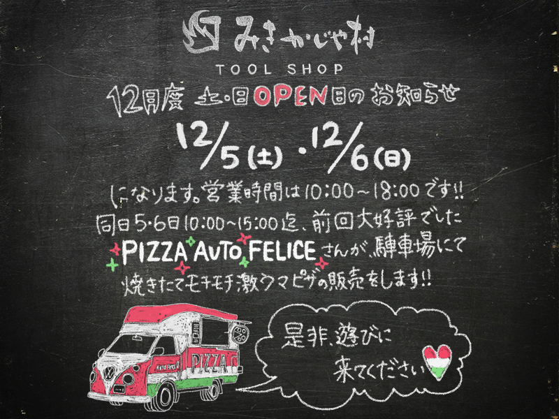 みきかじや村TOOLSHOP 12月の土・日オープン日は、12月5日(土曜日)、6日(日曜日)です!営業時間は午前10時~午後6時になります。新型コロナウイルスに対する対策として来店のお客様に対しマスク着用と入店前のアルコール消毒・検温を引き続きお願いしています。只今人気のアウトドアTOOLから大工道具、園芸用品、各種手打鍛造包丁まで手に取って見ることができます。また、同日12月5日(土曜日)、6日(日曜日)午前10時~午後3時までPIZZA AUTO FELICEさんが焼き立てピザをキッチンカーにて販売します!ふわふわもちもち食感の生地にこだわりの具材と厳選したチーズをたっぷりトッピング!めちゃくちゃ美味しいですよ~この機会にぜひ!皆様のご来店心よりお待ちしております!
