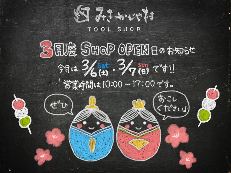 みきかじや村TOOLSHOP 3月の土・日オープン日は、3月6日(土曜日)、7日(日曜日)です!営業時間は午前10時~午後5時になります。新型コロナウイルス対策としてご来店のお客様にマスクの着用とアルコール消毒のご協力をお願いしています。皆様のご来店心よりお待ちしております!