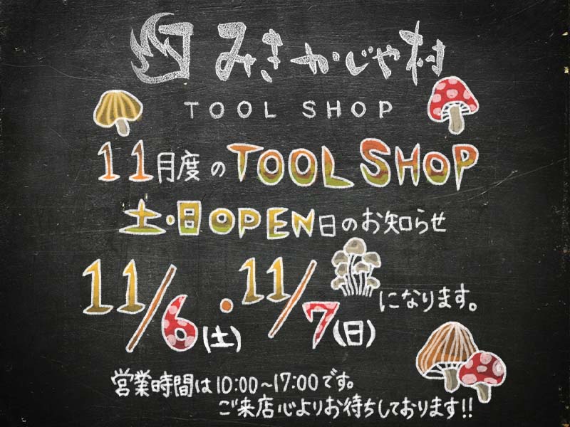 みきかじや村TOOLSHOP11月の土・日オープン日は、11/6(土)・11/7(日)です!営業時間は10:00~17:00となります。平日ご来店できない方はこの機会にぜひご来店ください。心よりお待ちしております。