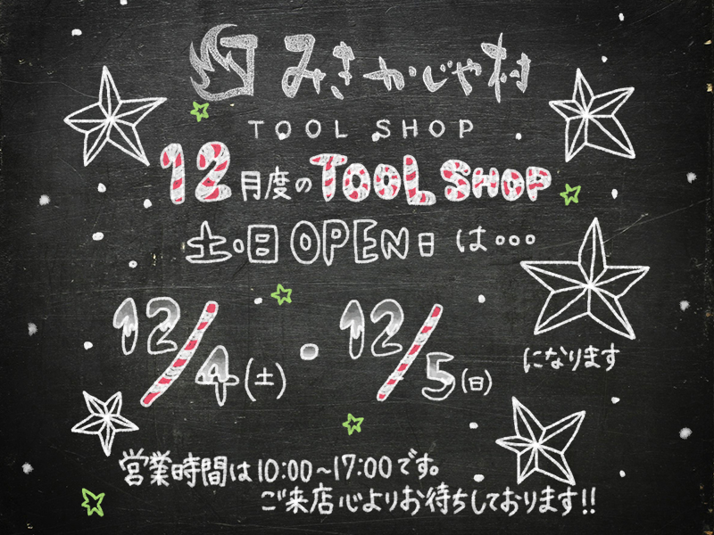 みきかじや村TOOLSHOP12月の土・日オープン日は、12/4(土)・12/5(日)です!営業時間は10:00~17:00となります。平日ご来店できない方はこの機会にぜひご来店ください。心よりお待ちしております。