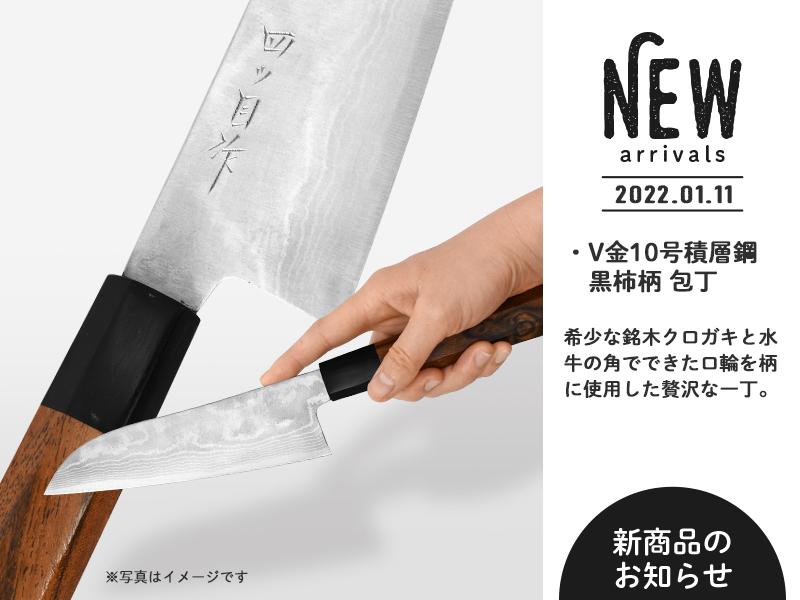 四ツ目印の藤田丸鋸工業株式会社から、希少な銘木「クロガキ」と、口輪部分に水牛の角を使用した贅沢な包丁のご紹介です。シンプルな形状ですが高級感があります。三徳包丁とペティーからお選びいただけます。詳しくは商品ページをご覧ください。