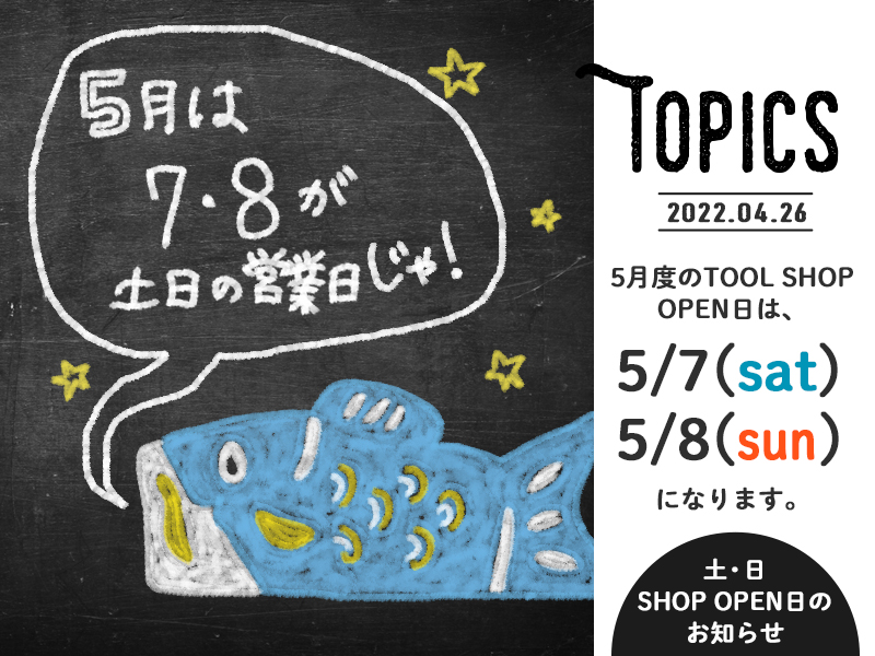 みきかじや村TOOLSHOP 5月の土・日営業日は、5/7(土)・5/8(日)です!営業時間は10:00~17:00となります。平日には来られない方はこの機会にぜひお越しくださいませ、お待ちしております。